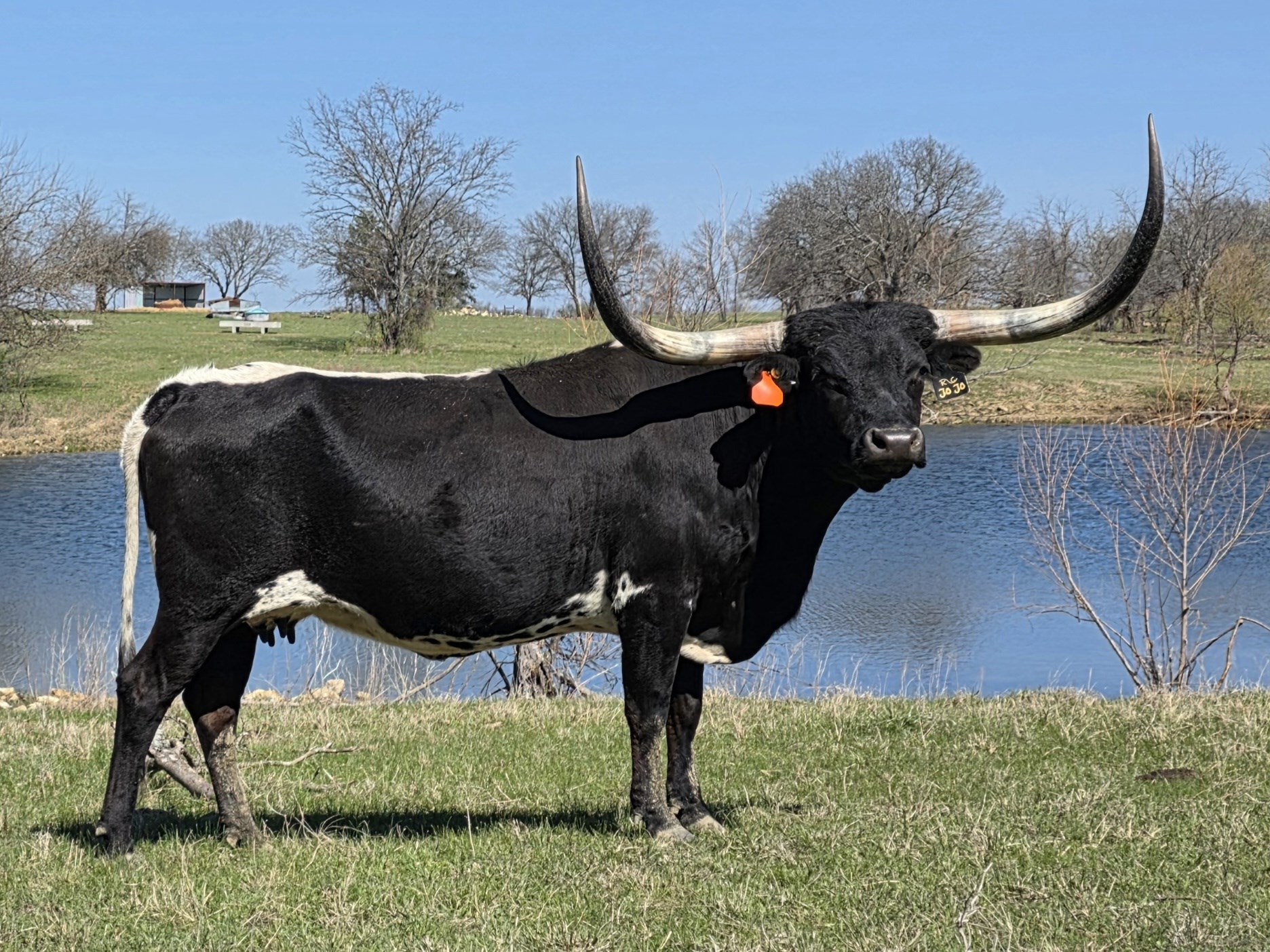 Meet Coffee Talk, a big, strong show cow with a commanding presence and impressive horns measuring 51 TTT. With genetics that range from 90 to 100 inches, she’s primed to grow into a truly spectacular animal. Her build combined with her stunning horns and top-tier lineage, makes her an outstanding addition to any herd. Whether you're looking to enhance your breeding program or showcase her in the ring, this cow is sure to turn heads and make a lasting impression.