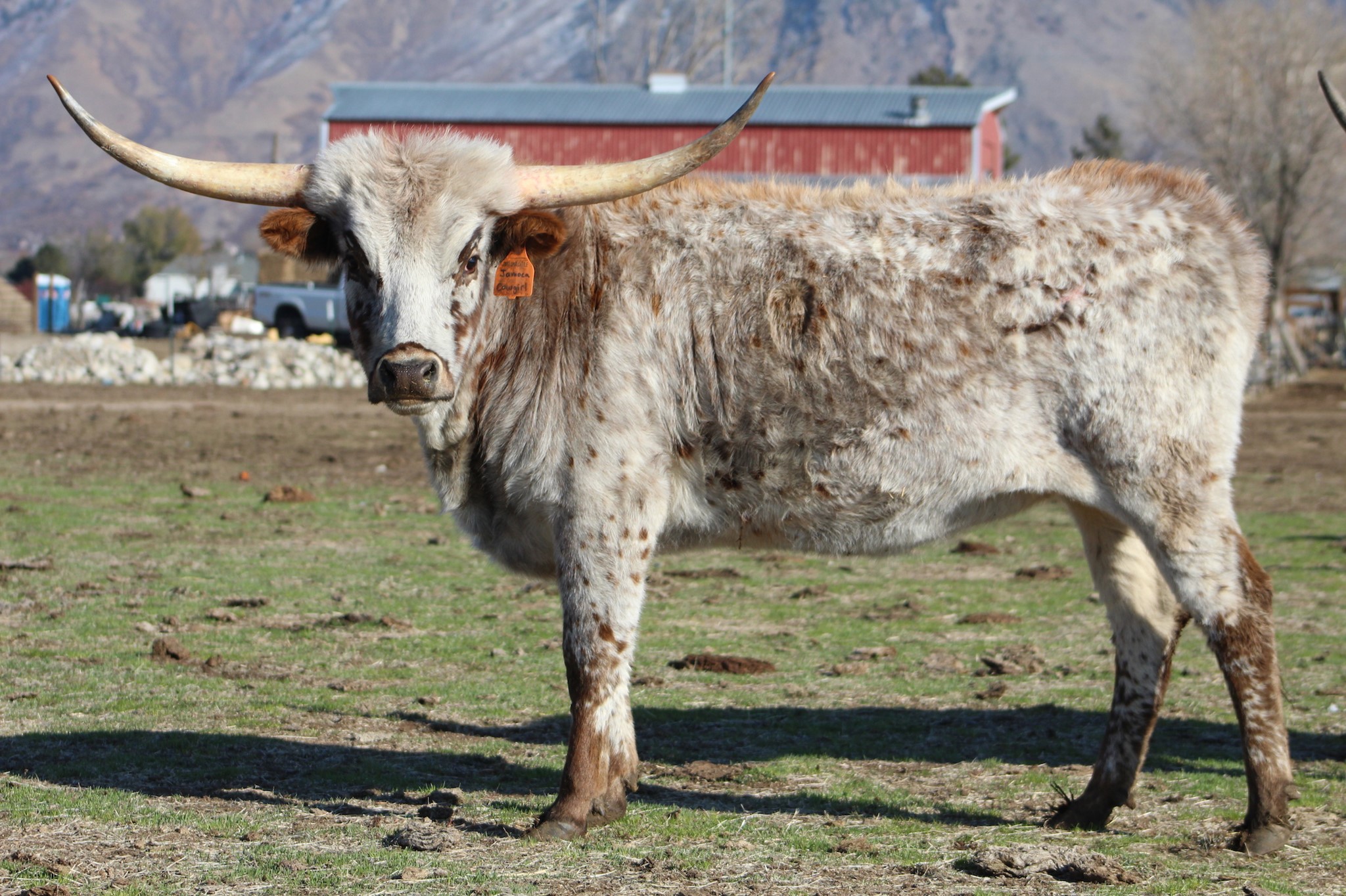 DSCC Jamoca Cowgirl is a beautiful Cowboy Flair daugher. She got a ton of speckles from her sire. Her maternal grand mother is a full sister to WS Jamakizm. Talk about a star studded pedigree. DSCC Jamoca Cowgirl gave birth to a beautiful 20 Gauge heifer on June 22, 2023. We're excited to see her mature.