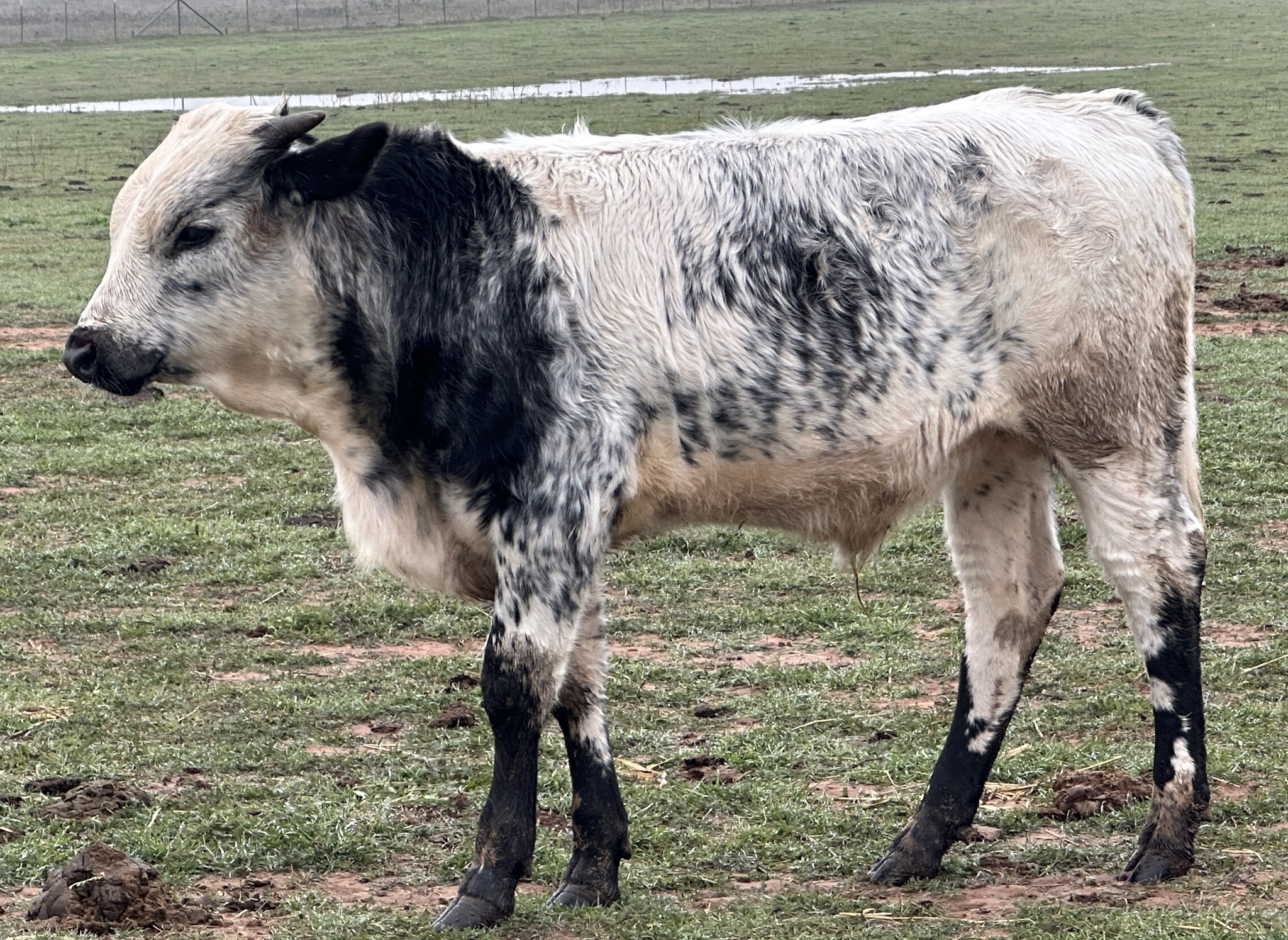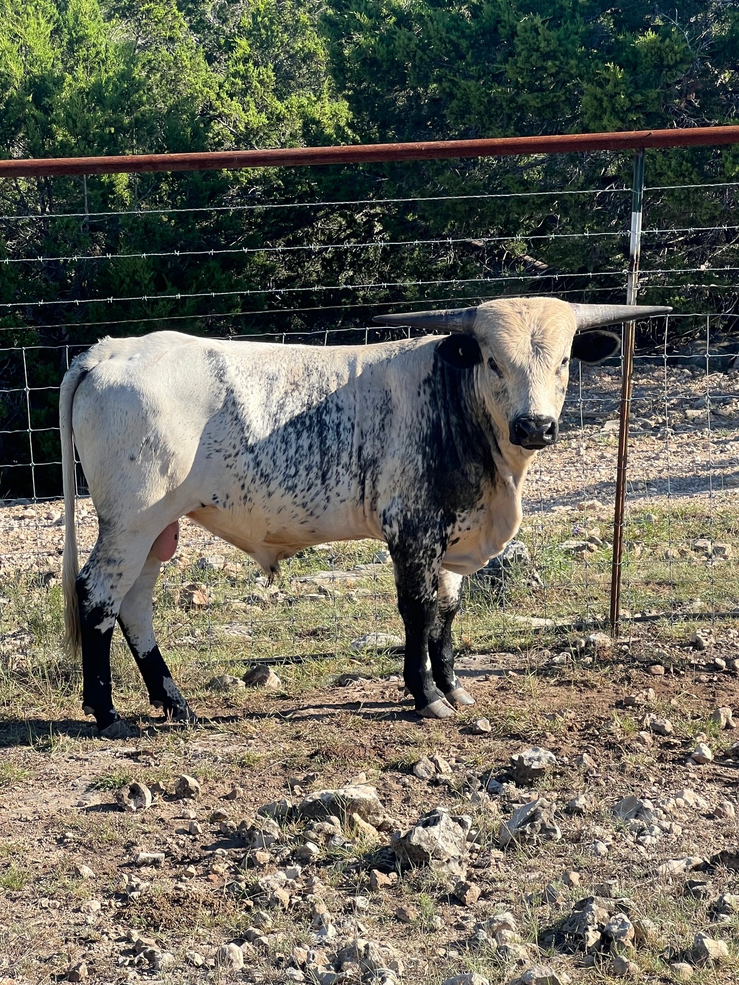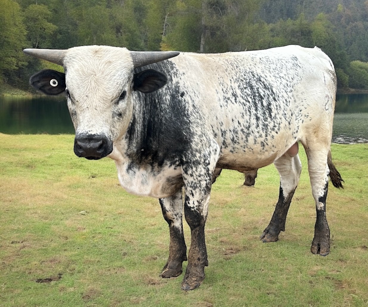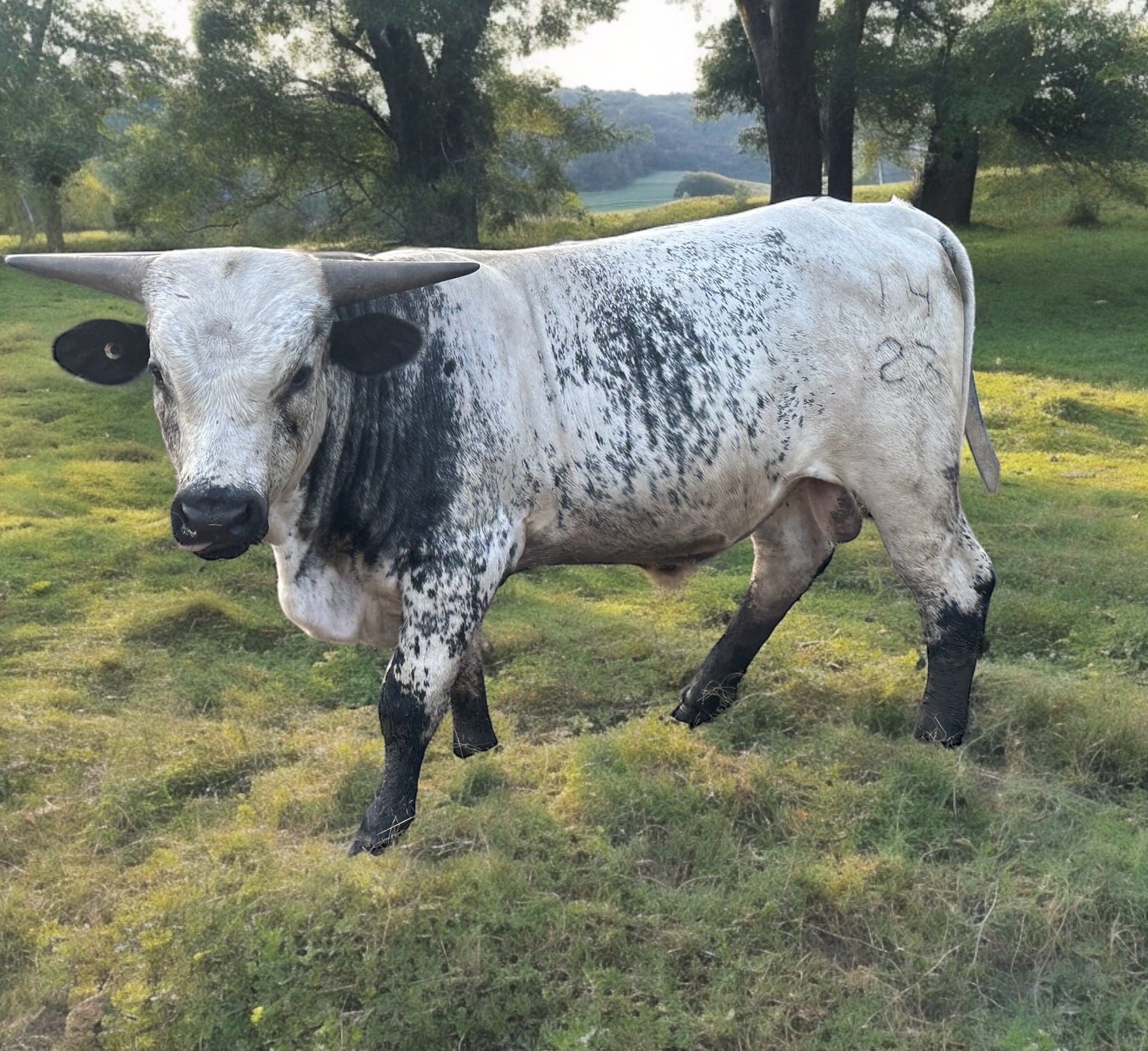 We purchased him as a 1 year old from M7 Longhorns in the summer of 2024. His sire is the one and only WS Hydro, who provides unique color patterns in most of his offspring. His dam is a tall, true black cow out of CV Cowboy Casanova & WS Midnight. His first crop of calves are hitting the ground this fall, and boy does he sure throw some crazy color!
