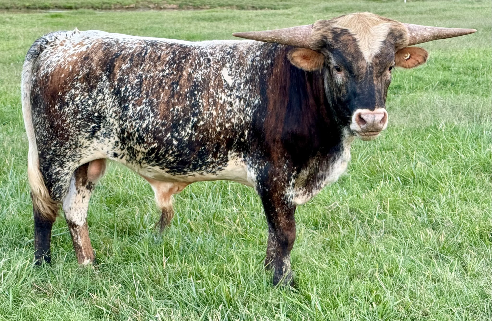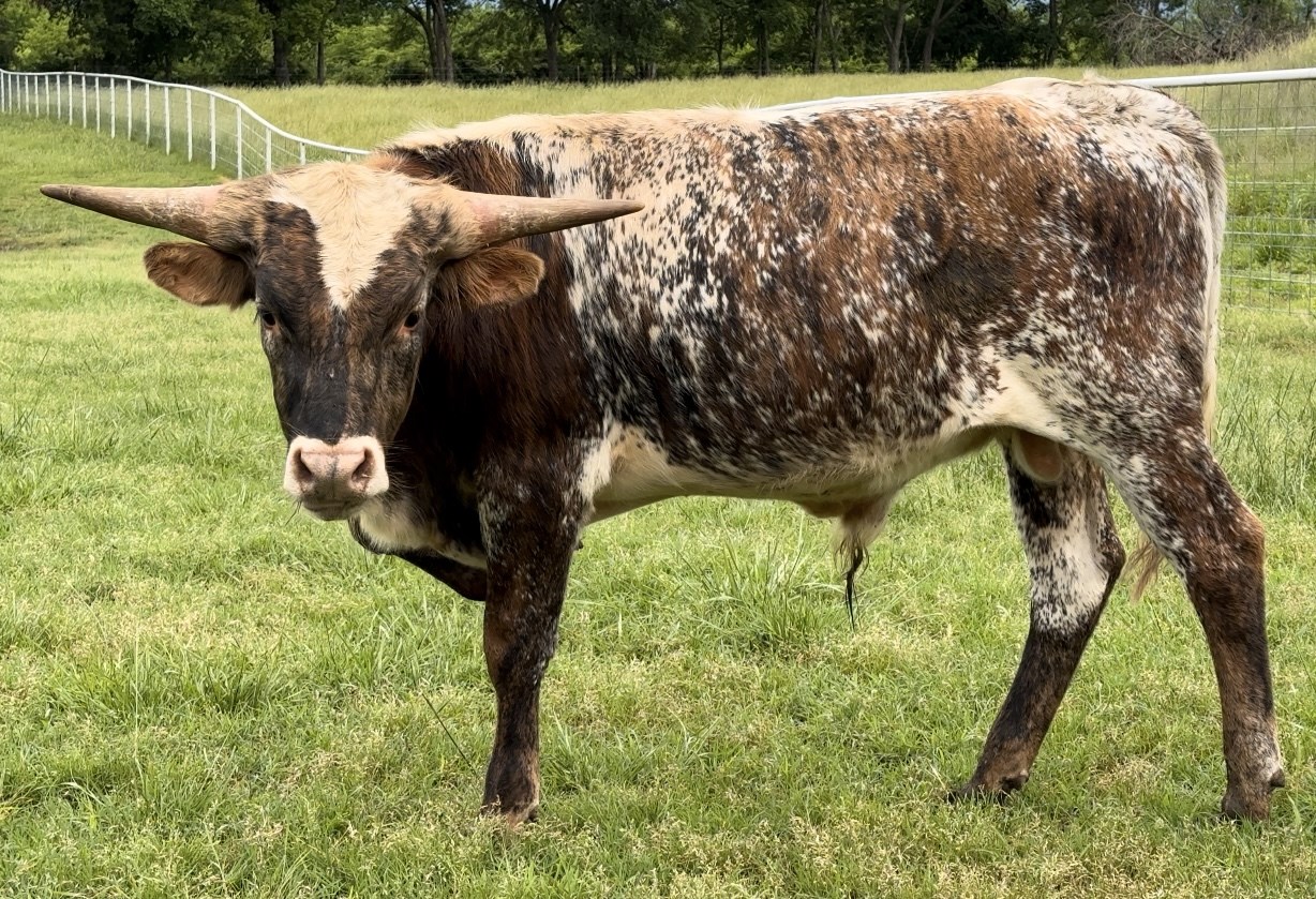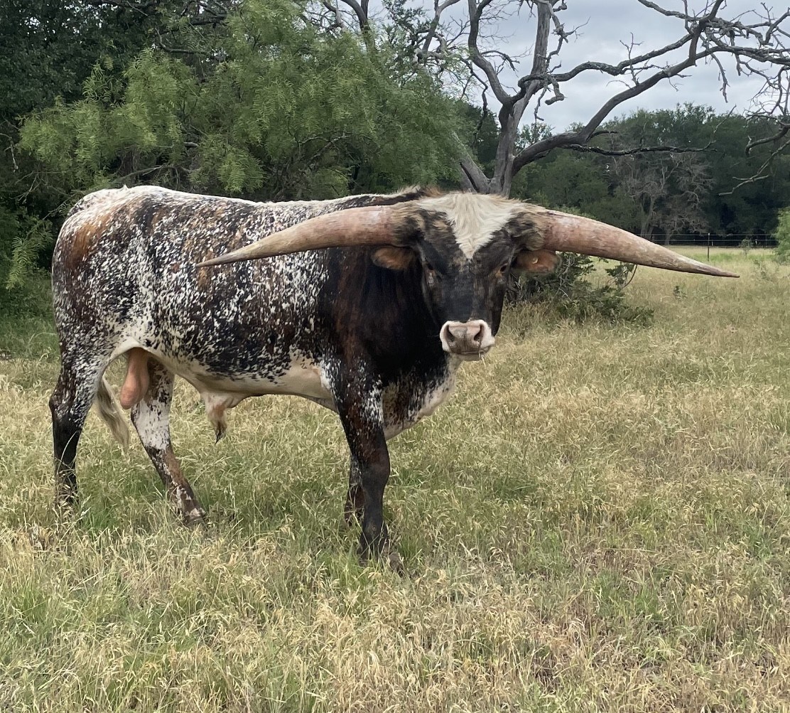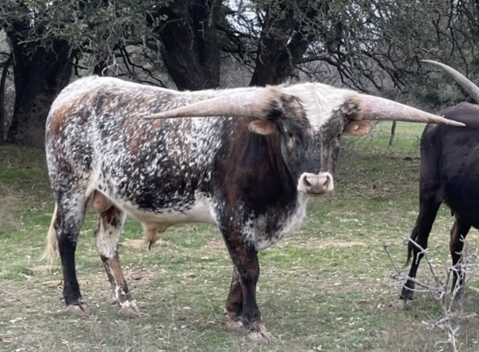 Unbelievable what this young 2 yr old is turning into. Love that his sire is Cactus Jack with what hes putting on the ground as well as his bottom side with Gold Mine. Love his mother PCC Golden Palace and grandmother Titans Pepper EOT. He was a double bronze winner in 2025 winning his class in total horn and composition missing the TTT by less than half of an inch...measuring over 77" a few days before turning 27 months old. Over 92" of total horn at that time. An awesome color with an incredible leather coat and his body is getting bigger than I thought he would be. He has accomplished all of this while being turned out on heifers at 12 months to start breeding. He loves head scratches but since he is a little stubborn it makes a little difficult to work in the pens. He likes to back up when you're trying to push him. All of his calves are looking super with great thickness and we're looking forward to his great looking future.