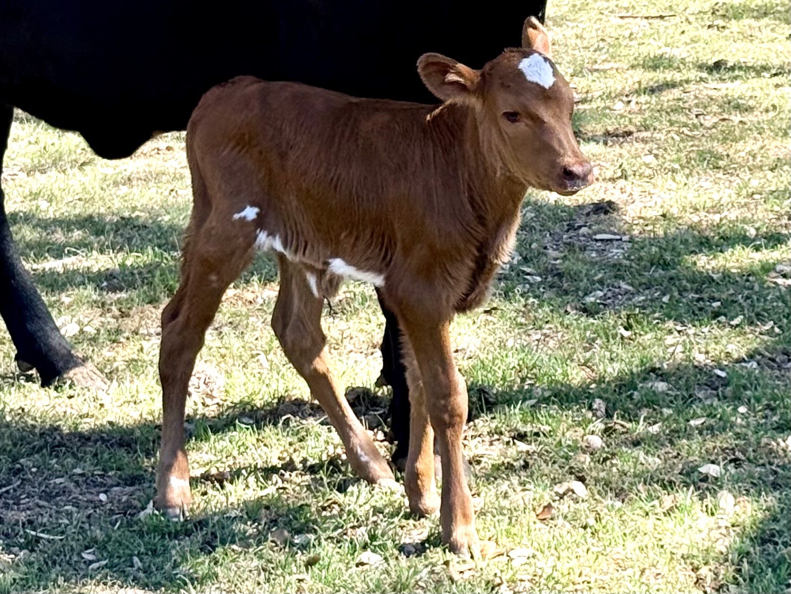 Red with white star on forehead, white belly, and small white patches on right thigh and left shoulder