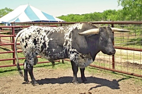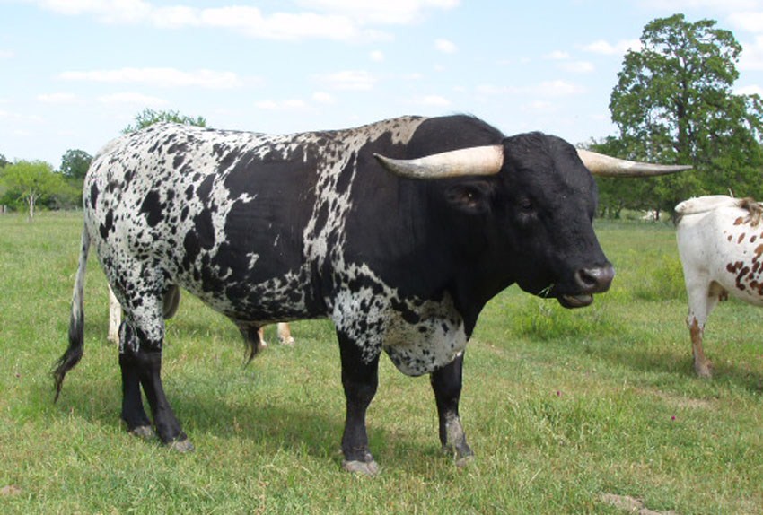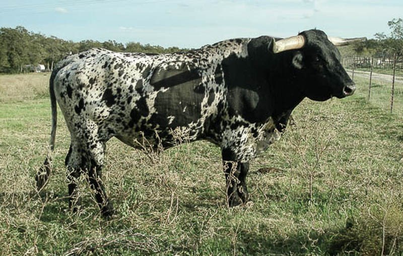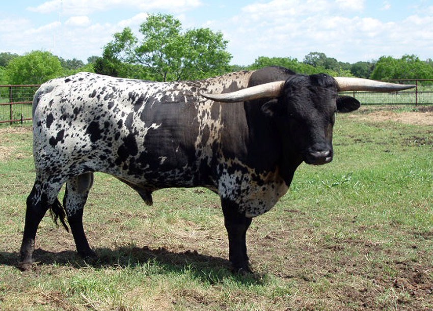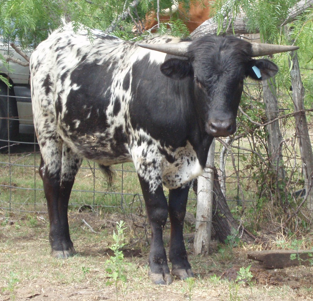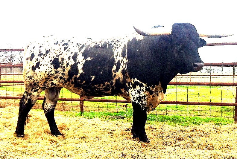Foundation of size and weight for our herd. He passes color, utter and hip. His adequate flat horns compliment the high horned cows for straight horned calves