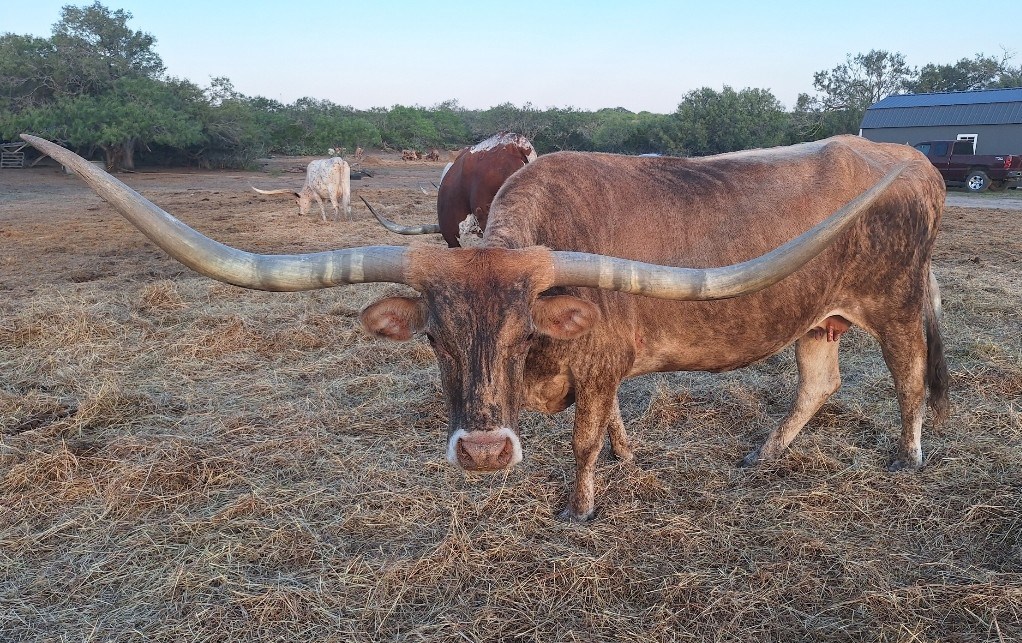 Husband, who's herd is DTL, bought Lacy River on 02/25/2023 at the 2023 Struthoff Ranch Production/Reduction Texas Longhorn Sale. Horns were 79.75 in '23, she'll be over 80" now. Two beautiful brindle heifers from her in two years, due again anytime. Go Lacy!!!
