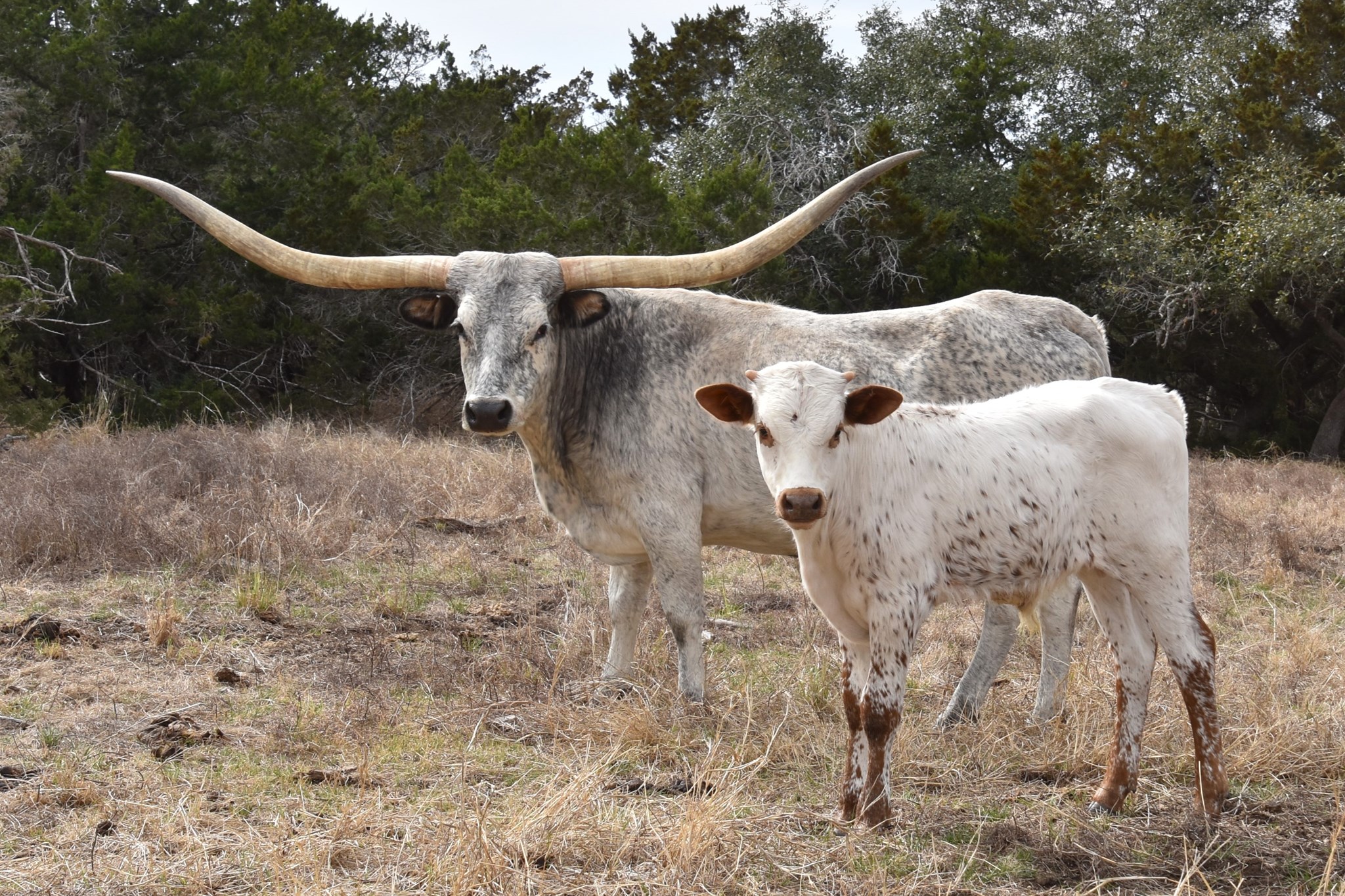 a smoky grey / blue steel roan big, bodied cow with over 91 +inch tip to tip horns. stacked horn genetics. Look at the stacked genetics & colors