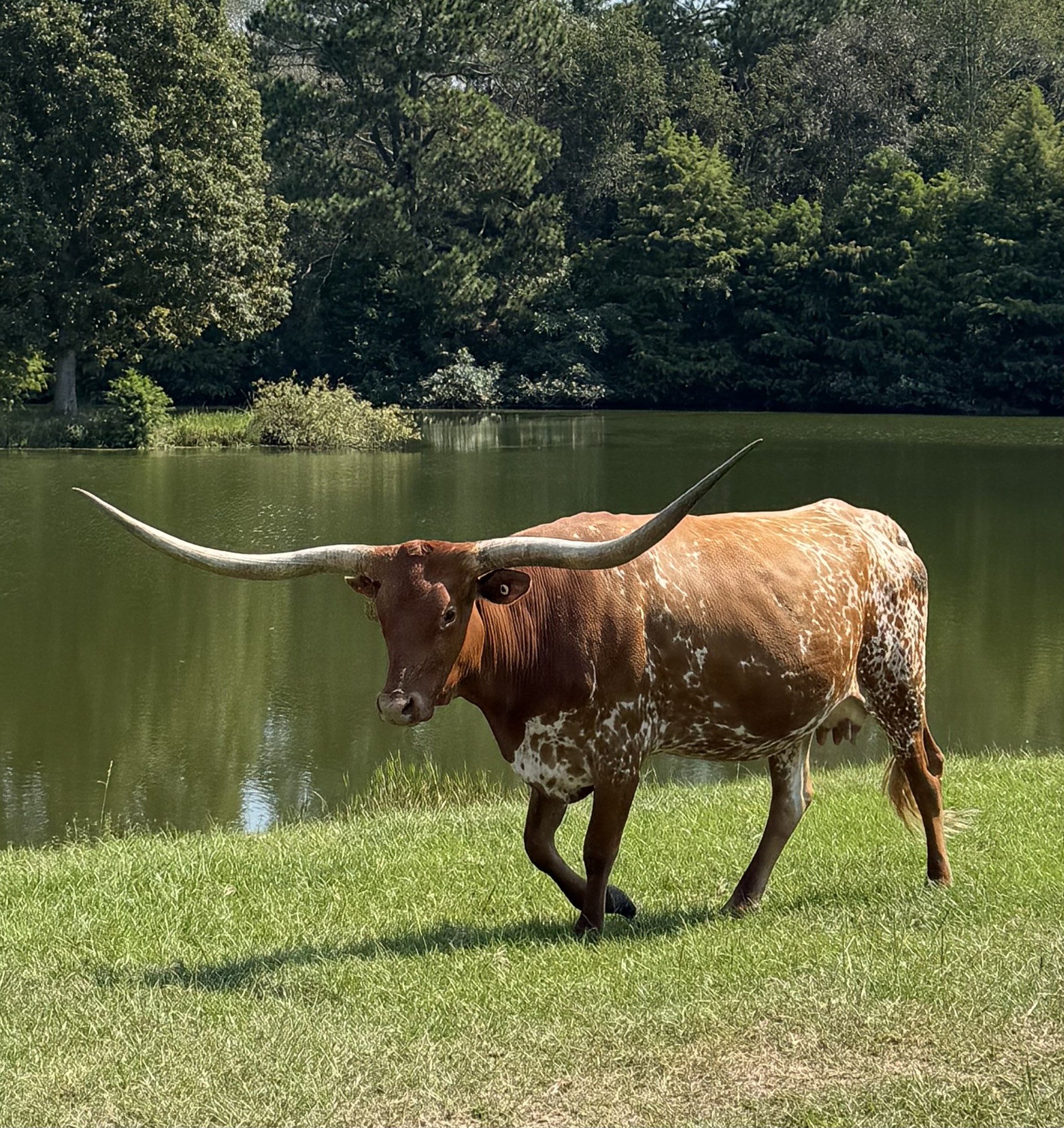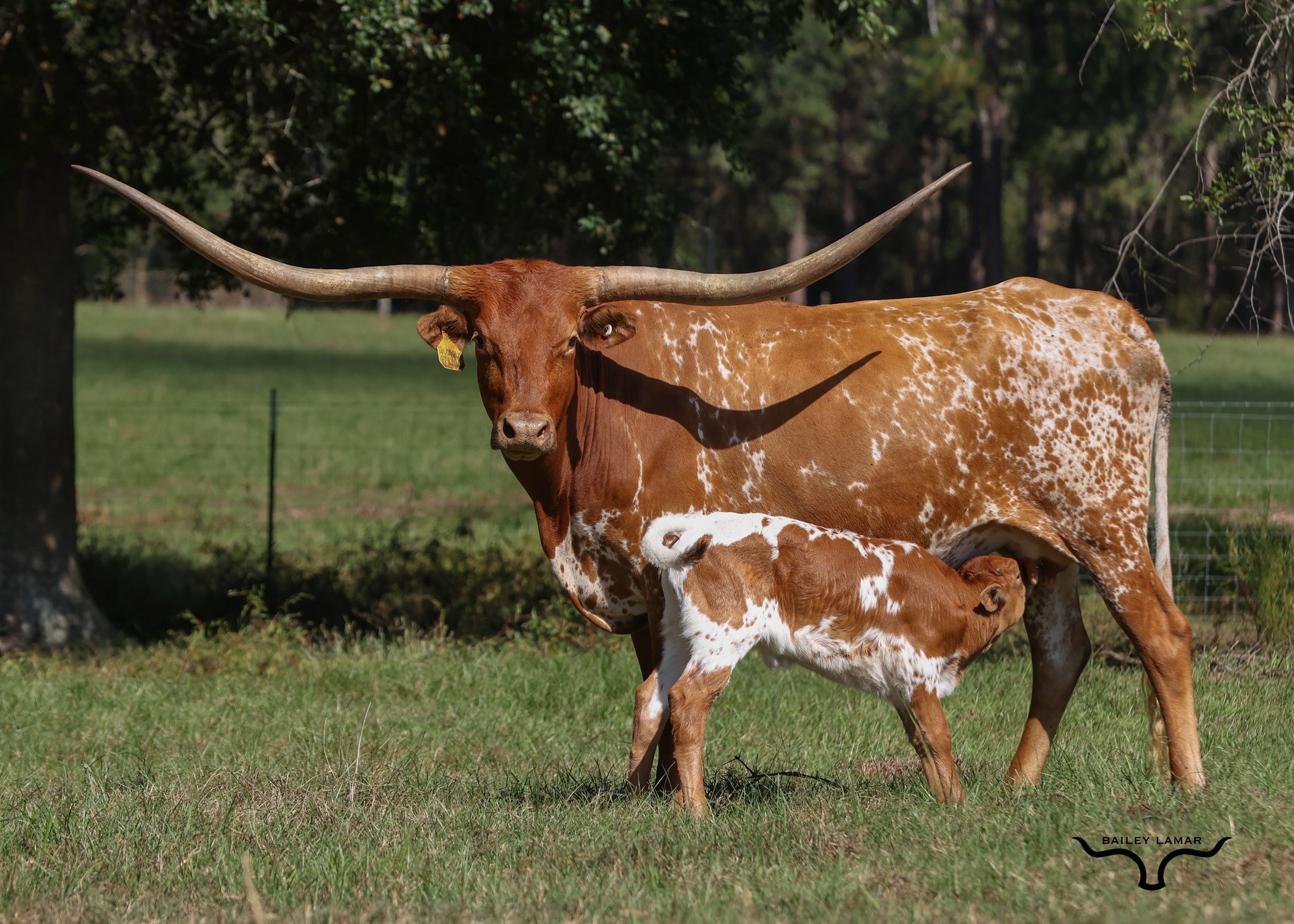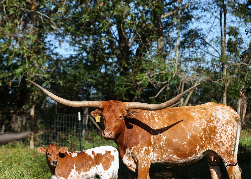 We love this colorful young lady and a daughter of Hot Playboy. She has a nice conformation, great horn direction, calm disposition, and beautifully marked. On the maternal side she goes to WS Jamakizm, and Sittin Bull, on the paternal side she goes to Boomerang CP, and J.R Grand Slam. Her calves are correct and beautiful and we are looking forward to great offspring from her.