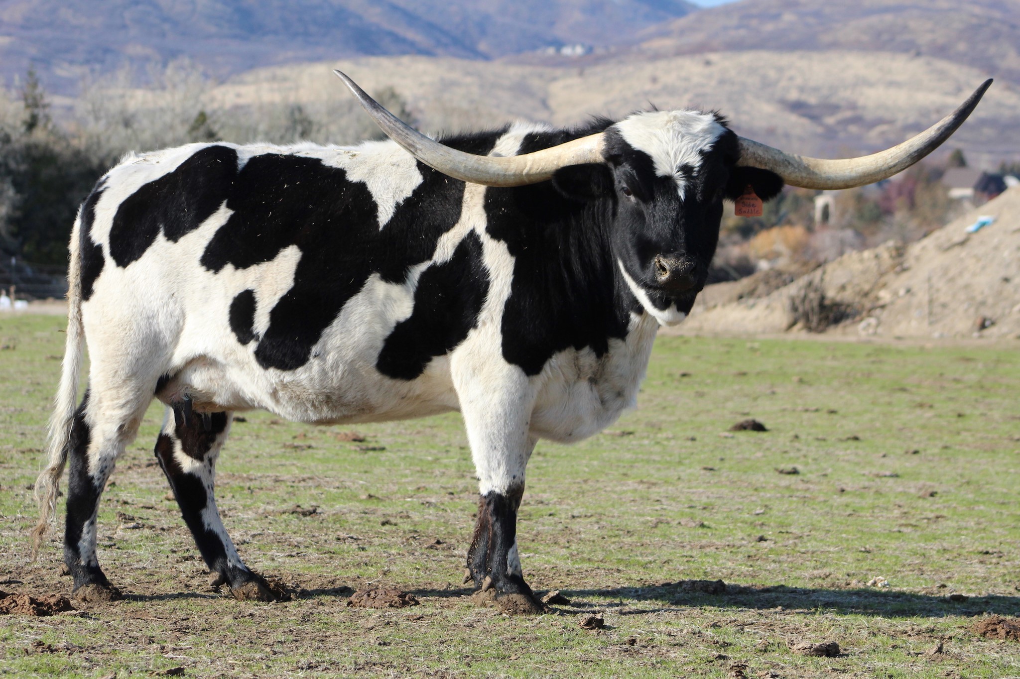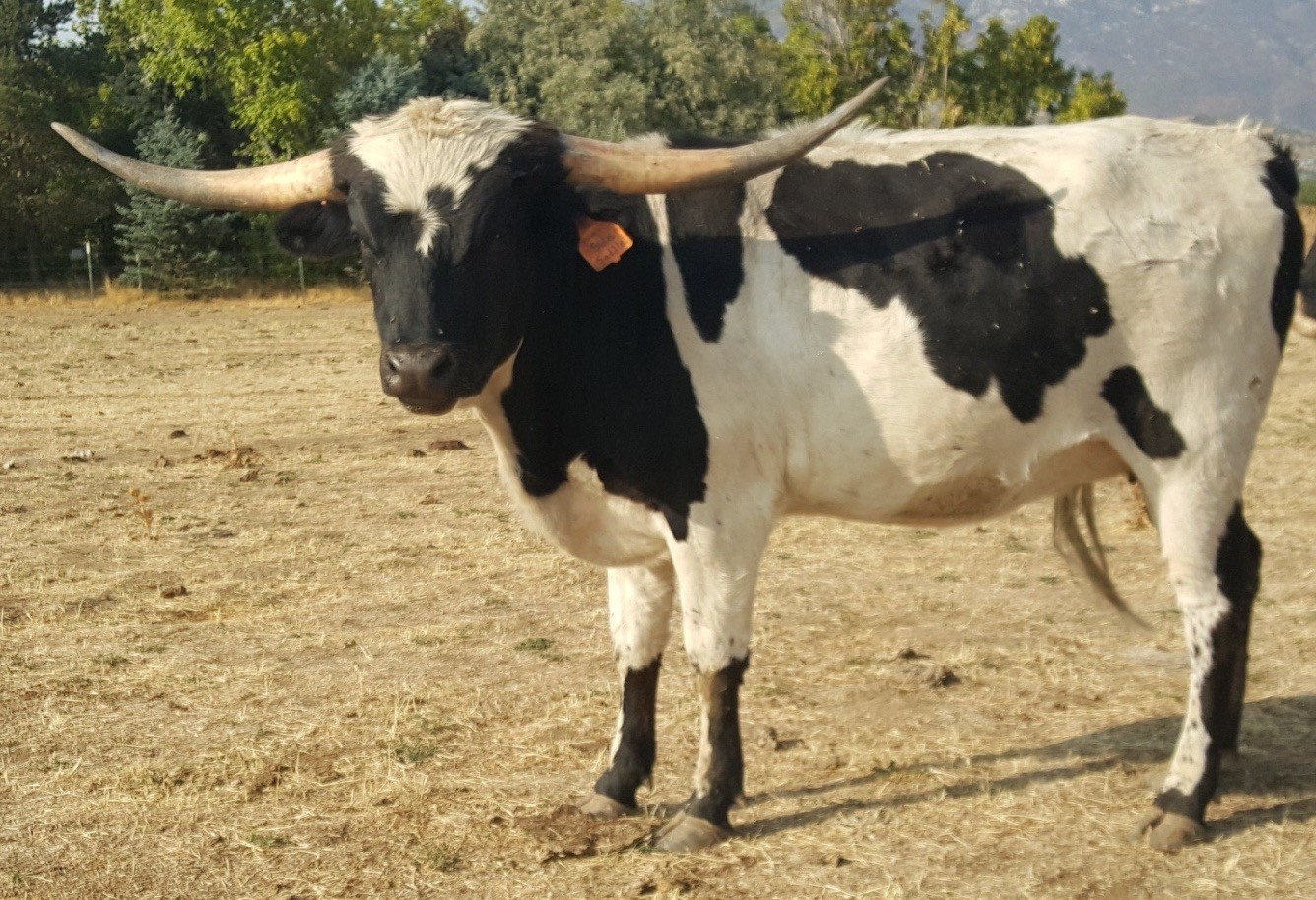 Beautiful black and white paint Saddlehorn daughter out of a Tibbs daughter. She has the most laid back horn we have ever bred here at Dirty Spur Cattle Company. Both lines carry this gene in the extreme and she sure is adding to this wonderful trait. She has been a great producer for us with many nice progeny. She most recently had a beautiful Cowboy Flair bull calf on 11/11/2023.